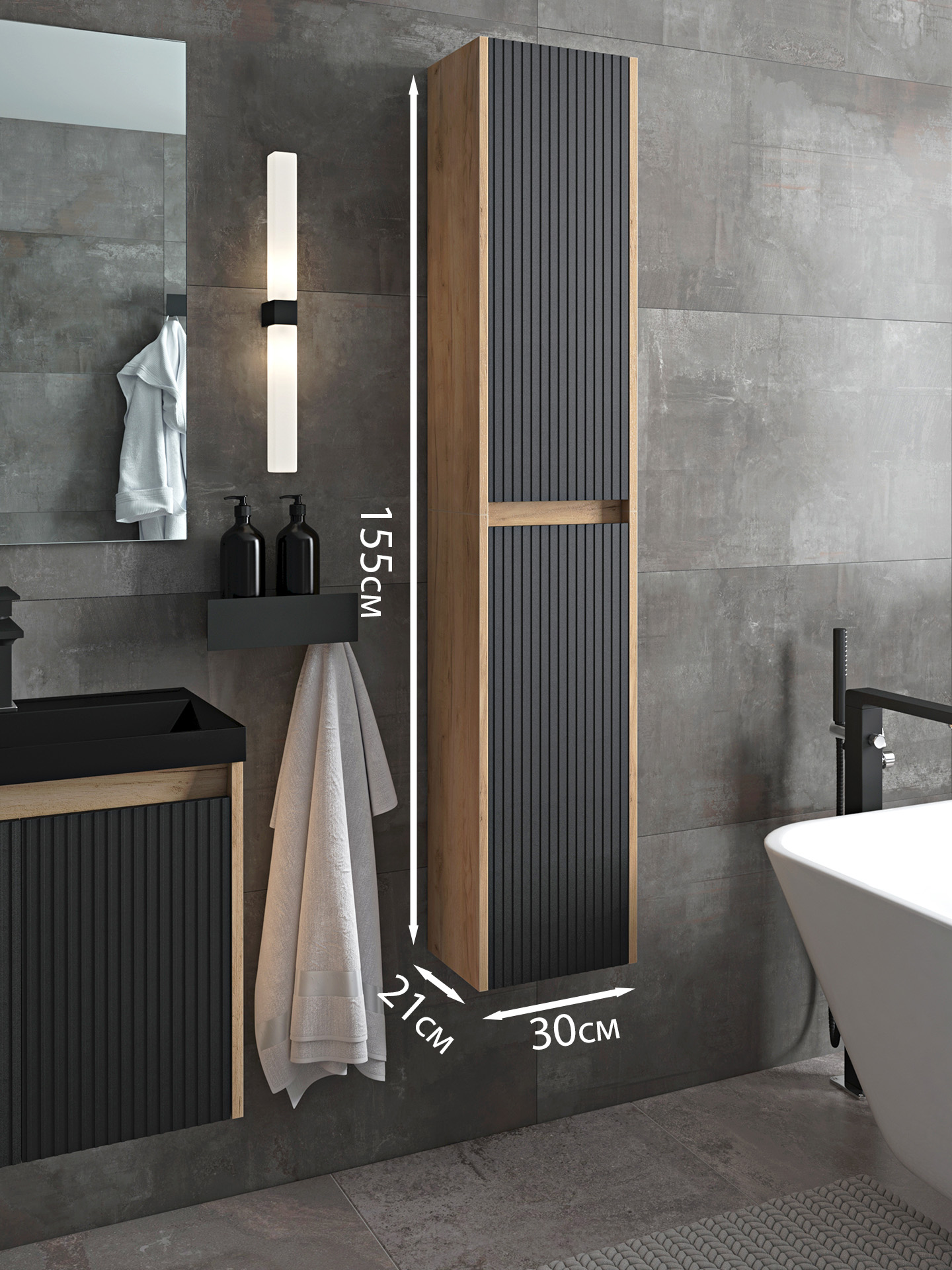 Шкаф пенал в ванну 30 подвесной дуб черный